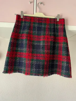 Falda corta con estampado de cuadros estilo tweed. Muy elegante y fácil de combinar, ideal para otoño/invierno. En muy buen estado, sin estrenar Queda preciosa con botas o tacones. Talla XS - Diseño de cuadros. - Tejido tipo tweed.