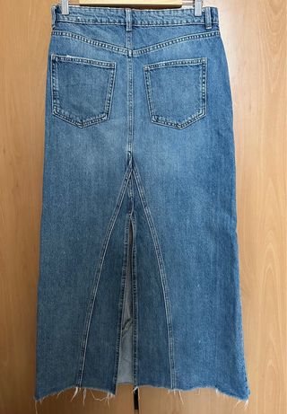 Falda vaquera de corte midi, ideal para cualquier ocasión. Es una prenda nueva con etiqueta. - Diseño clásico de cinco bolsillos. - Cierre de cremallera y botón. - Costuras reforzadas.