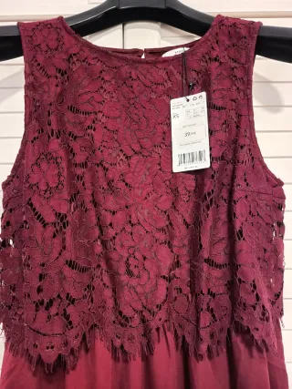 Vestido elegante de color granate con detalles de encaje en la parte superior. - Diseño sin mangas. - Corte que favorece la figura. - Tejido ligero y fluido en la falda.