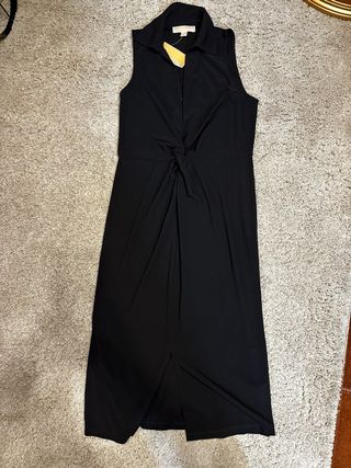 Vestido elegante de Michael Kors, sin estrenar en talla S, en negro, tejido fino, comprado en Marshalls en Estados Unidos. - Diseño sin mangas. - Detalle de nudo en la cintura. - Cuello camisero. - Abertura frontal en la falda.