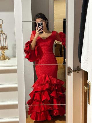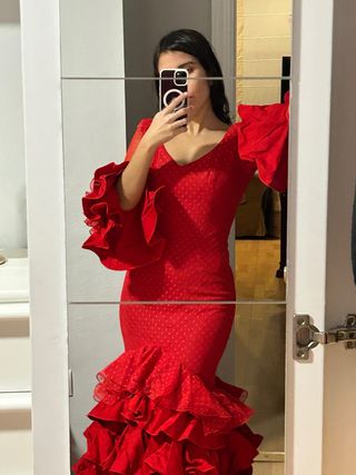 Traje de flamenca con un diseño elegante y llamativo. Talla 34/36 38/40 maximo 42 - Mangas largas tipo campana. - Volantes en cascada en la falda. - Escote V