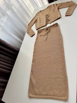 Conjunto de falda y top de punto de Mango. Talla 34 XS. Tejido elástico. Color beige dorado. Falda nueva con etiqueta. Top no tiene etiqueta, pero nunca se ha usado.