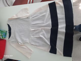Elegante vestido de dos piezas con detalles de encaje. - Parte superior de encaje blanco con mangas largas, es una rebeca - Falda negra de corte recto. -El cinturón se puede poner o quitar, según tu preferencia. Valorado en 280€