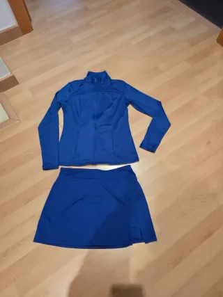 Falda pantalón deportiva de color azul. Diseñada para la comodidad y el movimiento. - Cintura elástica. - Abertura lateral - Con bolsillo lateral en el pantalón interior - Tejido tecnico y fresco - Chaqueta con cremallera, bolsillos y apertura en la manga para meter el dedo.