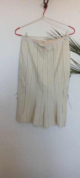 Falda usada varias veces y en perfecto estado. Color crema con raya diplomática, forro acabado en gasa que sobresale y con unos pequeños volantes en la parte trasera que quedan muy bonitos. Corte que estiliza mucho.