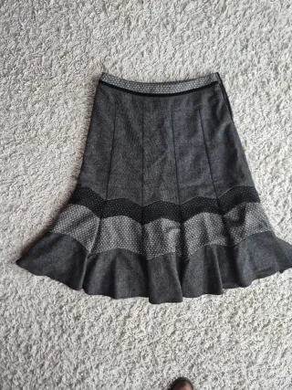Elegante falda de Max Mara con un diseño de capas y detalles. - Diseño acampanado con volantes. - Tejido texturizado en gris. - Detalles de zigzag y lunares. - Cintura con banda decorativa.
