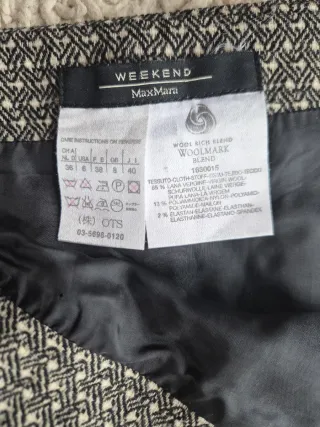 Falda de tweed tejido con estampado de espiga en tonos marrón, blanco y negro corte recto hasta la rodilla o ligeramente por encima, con forro interior y una pequeña apertura en la parte de atrás, y cremallera talla 42