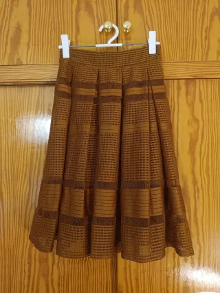 Falda midi de color marrón con un diseño plisado y detalles de rayas. - Tejido con textura calada. - Diseño con pliegues. - Detalle de bandas horizontales. Largo 65 cm