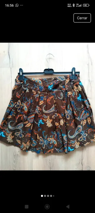 Falda de vestir en color marrón, con un diseño moderno y detalles que la hacen única. - Dos botones decorativos en la parte frontal. - Costuras en forma de V que añaden un toque estilizado. - Abertura en la parte inferior central. Se vende falda de paño de color marrón. talla 48 5€