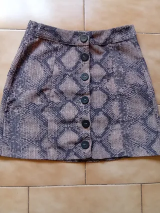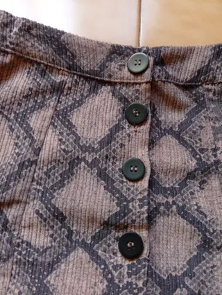 Falda corta con estampado de serpiente y detalle de botones. - Diseño de serpiente en tonos marrones y grises. - Cierre de botones en la parte delantera. - Tejido de pana con textura.