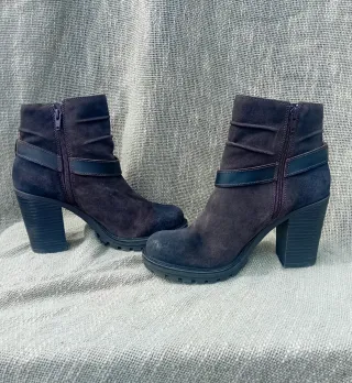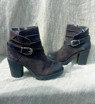 🖤 Botines REPLAY preciosos en ante marrón oscuro/gris con tacón grueso y correa estilo biker. ✨ Modelo muy versátil: perfecto con vaqueros, faldas o vestidos para looks boho, casual o Y2K. 👢 Talla: EU 39. 🤎 Color: marrón oscuro/gris. 🌿 Material: exterior tipo ante con suela resistente. ⭐ Estado: muy bueno. Solo ligero desgaste en la punta (visible en fotos), por lo demás muy bien. 📦 Envío rápido. Perfect for: Y2K / biker / boho / casual / autumn outfits.