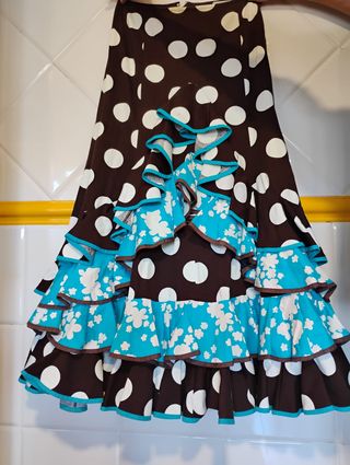 Falda de estilo rociero ideal para romerías y para hacer el camino, es muy campera. - Color base marrón-beige. - Volantes inferiores con estampado floral. - Cierre de botones en la parte delantera. - Es una talla 38-40.
