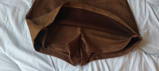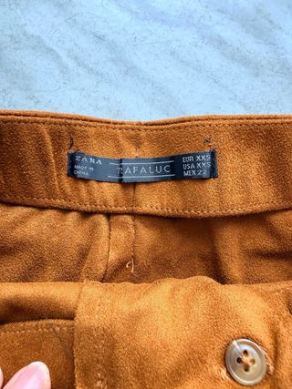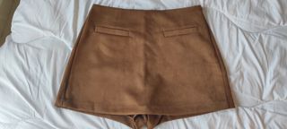 Prenda tipo falda pantalón de ante en tono marrón. - Diseño con trabillas en la cintura. - Cierre de botón y cremallera. - Bolsillos delanteros. - bolsillos traseros.