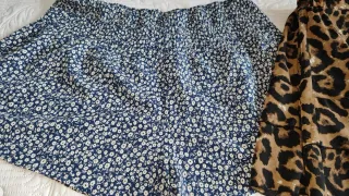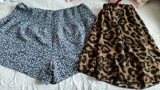Conjunto de dos faldas ligeras de talla XL. La de flores es un shortancho tipo falda. - Falda short, con estampado floral en tonos azules. 40 cms de largo - Falda con estampado de leopardo en tonos marrones. 44 cms de largo. Tamaño normal, no muy corto. Hago envios y lotes. También entrego delante de mi oficina, está situada entre Barcelona sagrera-meridiana y congres ( línea 5 azul), y Vilafranca del Penedés los fines de semana. Regalo de otra ropa XL. Lo que cabe en la caja.