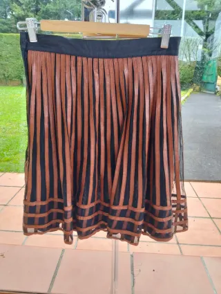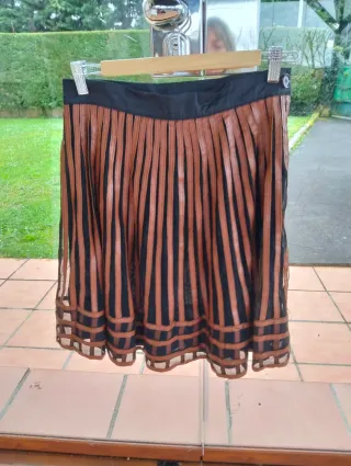 Falda de la marca M de Miguel con un diseño original. - Diseño de tiras verticales en marrón sobre fondo negro. - Detalle de cintas horizontales en el bajo. - Tejido ligero y con caída.Marca una talla pero de cintura mide 36cm