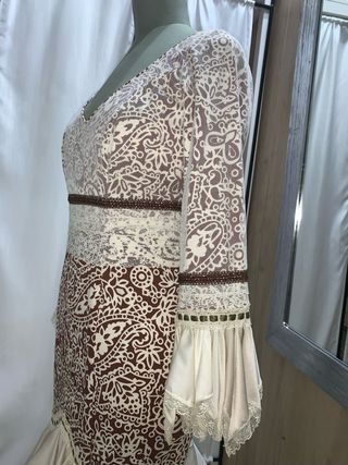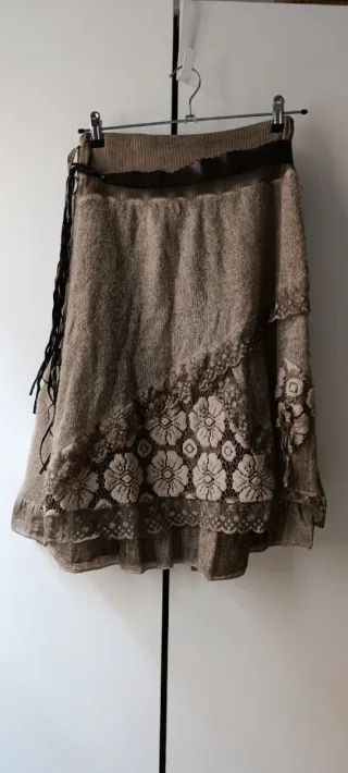 Falda de estilo romántico y boho chic, con un diseño único. - Tejido principal en tonos beige y marrón. - Detalle de encaje floral en la parte inferior. - Cinturon incluido con tiras decorativas. La cintura es de goma elástica. Cintura 36 hasta 50 cm estirándose Largo 67 cm