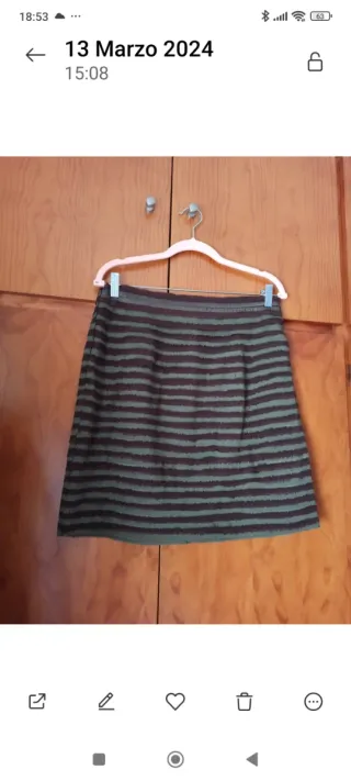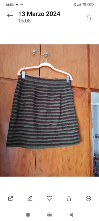 Falda corta marca Trucco, en tonos marrones y verdes con un diseño de rayas horizontales. Corte clásico Talla 42. Muy original, está hecha de tiras de tela en horizontal superpuestas unas a otras. Completamente forrada. Como nueva, casi sin uso. Medidas en las fotos. trucco minifalda falda corta falda talla 42 falda marrón y verde ropa en buen estado ropa como nueva talla 42 ropa mujer talla 42 Falda corte clásico Falda recta corta Fondo de armario Armario cápsula