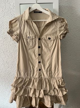 Vestido de manga corta con volantes. - Cuello camisero. - Cierre de botones. - Dos bolsillos en el pecho. - Falda con volantes en cascada.