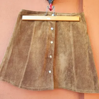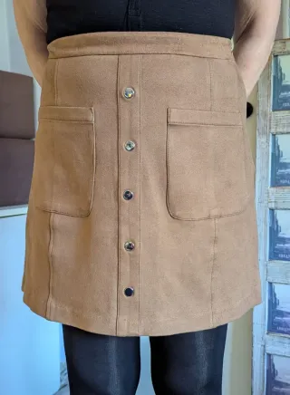 Vendo falda corta de color marrón claro. Es de pana. Posee cremallera y botón para abrir y cerrar. Tiene bolsillos delanteros y traseros. Es la talla 42 de mujer. Totalmente nuevo. Muy cómoda y elegante. Las medidas son: - Largo de la falda: 39cm - Cintura (sin estirar): 41 - cintura (estirada al máximo): 45,5cm - Cadera: 46,5cm