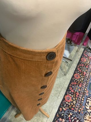 Falda de pana en color marrón, con un diseño moderno y detalles de botones. - Material: Pana - Cierre de botones frontales - Largo midi