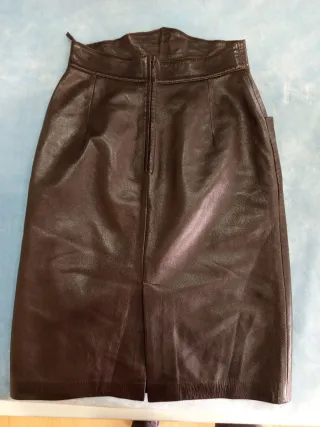 Falda negra de cuero fuerte, sin estrenar, con forro. 74 cms cintura, 94 cadera y 56 largo, hasta la rodilla. 30 E. Falda marron de cuero con forro, dos bolsillos, 72,10 cms cintura, 96 de cadera y 61,05 largo, hasta debajo de la rodilla. Sin estrenar. 25 E.