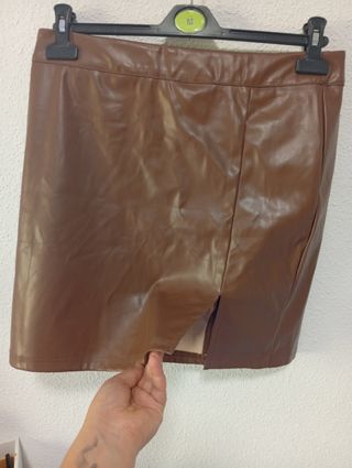 Preciosa minifalda de cuero sintético, ideal para cualquier ocasión. Es de color marrón y tiene una abertura lateral. - Corte entallado - Abertura lateral - Material: cuero sintético