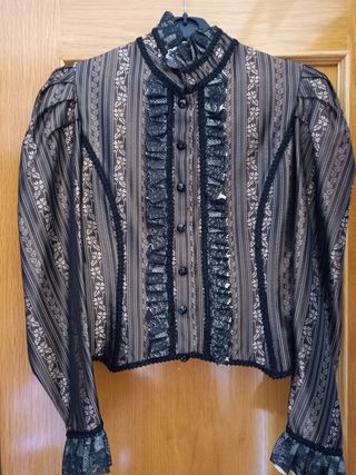 Precioso traje regional aragonés para mujer. Confeccionado a mano Está compuesto por una blusa negra de satén y una falda larga(77cm ) marrón con diseño de rayas verticales - Elegante blusa de satén. - Perfecto para eventos tradicionales.
