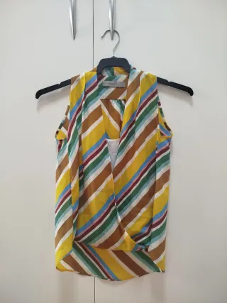 ✨ Blusa cruzada sin mangas Marella – Talla M ✨ Preciosa blusa sin mangas de la marca Marella, perfecta para verano 🌞 Es modelo cruzado y en la parte delantera lleva una camiseta interior integrada, lo que evita transparencias y hace que no se vea la zona del pecho. No transparenta nada, ni por delante ni por detrás, así que es muy cómoda y práctica. Tiene un estampado de rayas multicolor súper favorecedor (marrón, blanco, amarillo, rosa, burdeos, verde, azul…), ideal para combinar con jeans, pantalones blancos o faldas lisas. 📏 Talla M Medida de axila a axila: aprox. 40 cm