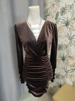 Vestido elegante de terciopelo marrón con pequeños brillos incrustados por toda la tela. Presenta un escote pronunciado en pico y un diseño fruncido en la falda que estiliza la figura. - Tejido de terciopelo suave. - Detalles de pedrería. - Mangas largas. - Diseño fruncido. Talla única equivalencia 38/40, no incluye el collar.