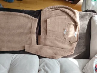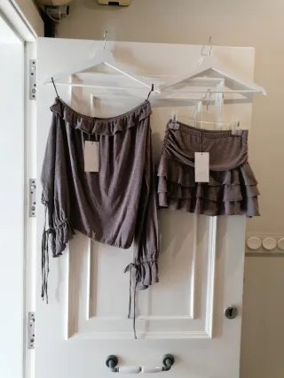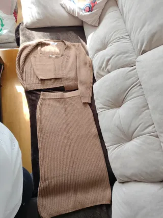 Conjunto de falda y bandolera de punto en color marrón. La bandolera es corta y de manga larga, el top es de tirantes y cortito y la falda es larga y ajustada. - Tejido de punto acanalado, está nuevo sin uso. No tiene ni una sola bolita. La marca no es de zara pero no me deja poner otra cosa.