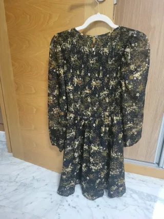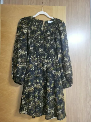 Vestido de gasa con estampado floral marron beige y dorado con brillantitos sobre fondo marrón oscuro. Talle fruncido. Es una XS no demasiado ajustado, sirve como una S. Usado solo una vez para ocasión especial. Su precio nuevo es 69,99 € se puede encontrar parecido en el corte inglés y en sarenza. - Diseño con cuello redondo y manga larga. - Cuerpo fruncido con detalle de volantes. - Falda con vuelo.