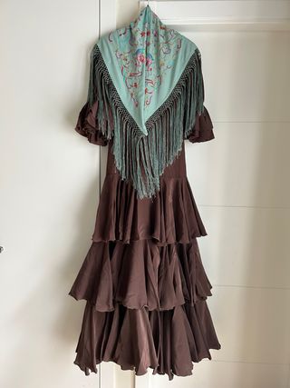 Traje de flamenca volantes verde y marrón
