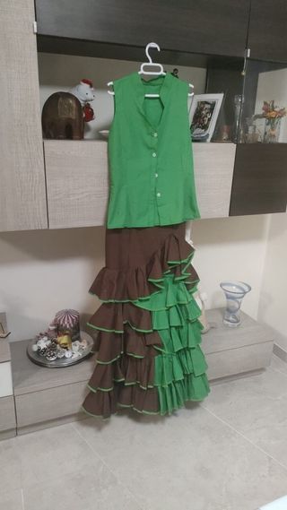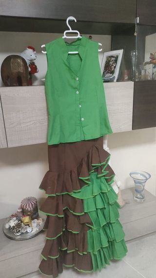 Conjunto de dos piezas para baile flamenco, compuesto por una blusa sin mangas y una falda larga. - Blusa de color verde con cuello mao y botones. - Falda larga con volantes en capas de color marrón y verde.