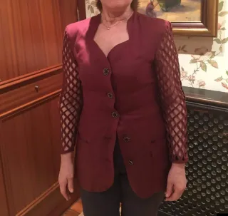 Elegante conjunto compuesto por una chaqueta de lino color marrón con mangas de rejilla y una blusa de gasa con lunares beige y marrón. La chaqueta tiene un corte clásico y botones decorativos. La blusa es ligera y vaporosa, ideal para primavera-verano. - talla italiana. 66% lino 6% polyester y 30% algodón. Chaqueta de lino marrón con mangas de rejilla. - Blusa de gasa con estampado de lunares. - Tallas: consultar.Blusa de Mercedes de Miguel