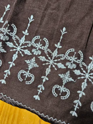Faldaf con un diseño elegante, de pana fina. - Detalle de bordados florales en la parte inferior. - Adornos con lentejuelas y pedrería. - Cintura con detalles de pasamanería. Medida contorno cintura 80, contorno caderas 104, largo 66, usado un par de veces