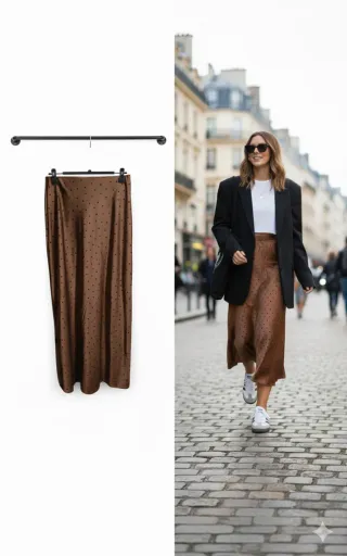 Elegante falda larga de satén en color marrón. Ideal para complementar tu armario. - Tejido satinado con un brillo sutil. - Diseño largo y fluido. - Cintura con detalle decorativo.