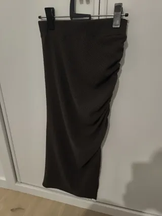 Falda midi de Shein con un diseño drapeado y fruncido en un lateral. - Color marrón. - Abertura lateral debajo del drapeado. - Talla S.
