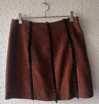 Falda de Adolfo Dominguez de tonos marrones y detalles en negro y adornos de flecos. Tejido tweed y textura Medidas De lado a lado cintura 42cm De lado a lado cadera 48cm Se venden también por separado.