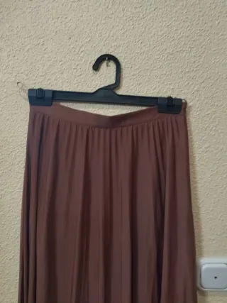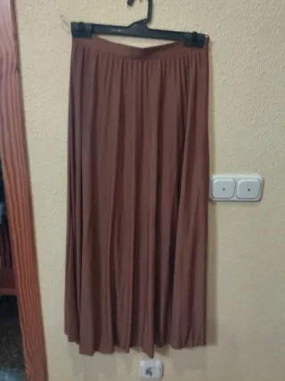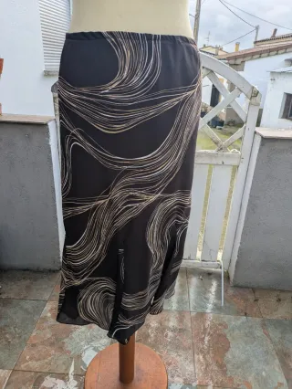 Falda de mujer en color marrón, talla 40 (ES) según etiqueta. Tejido ligero y fluido (tipo poliéster). Corte evasé con mucho vuelo, aporta movimiento y no marca. Con cremallera lateral, cómoda y fácil de poner. Ideal para entretiempo y otoño, muy favorecedora. ✔️ Buen estado ✔️ Sin manchas ni rotos ✔️ Limpia y lista para usar
