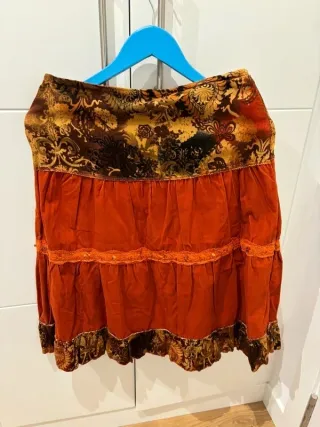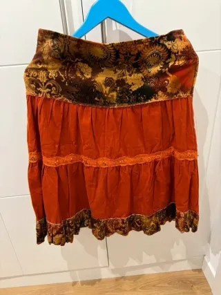 Falda de estilo vintage con un diseño único.Falda de estilo boho con un diseño vibrante y detalles únicos. Preciosa falda larga talla M-L de panilla color naranja y marrón . Contorno cintura 76 cm , largo 68 cm. - Cintura elástica con estampado floral. - Varios volantes y detalles de encaje. - Bajo con estampado floral.