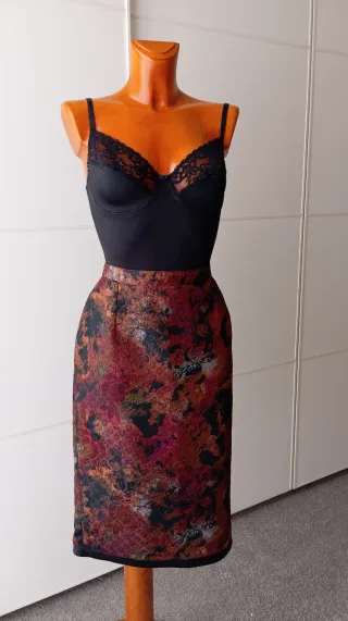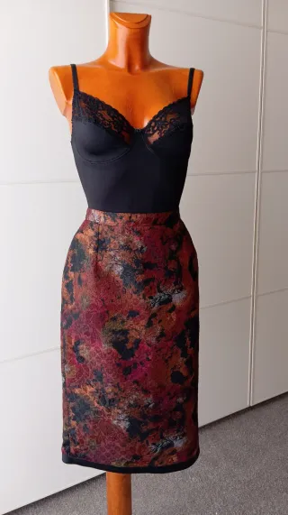 Falda vintage con estampado abstracto en colores,marrón, granate, negro y dorado. Forro interior negro. Ribete negro en el bajo de la falda con bonito detalle e la parte trasera. Botón y cremallera posterior. Nueva. Talla 38/40 aproximadamente . Si tienes dudas consulta las medidas. ✨💗 MEDIDAS 💗✨ Cintura 37cm Cadera 59cm Largo 68cm