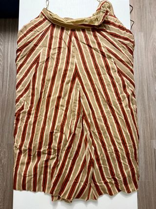 Falda de Gasa Largo Midi Color marrón chocolate con estampado de zonas de rayas en tonos beige Pequeños volantes de najas en el bajo Con vuelo Gasa con forro interior Cintura de goma. ⚠️La goma está cedida. Hay que cambiarla. De ahí su estado y precio. Talla 48-50 Medidas Cadera 72cm Largo 76cm Si necesitas más fotos o medidas dímelo Escucho ofertas Razonables Descuentos por lote hasta el 30% La prenda se entrega limpia