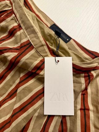 Falda midi de Zara con un diseño de rayas verticales en tonos beige y marrón. La falda tiene un corte fluido y elegante. Es de hilatura de algodón, tiene forro interno y cierre lateral oculto con una cremallera. - Diseño de rayas verticales. - Tejido ligero y con caída.