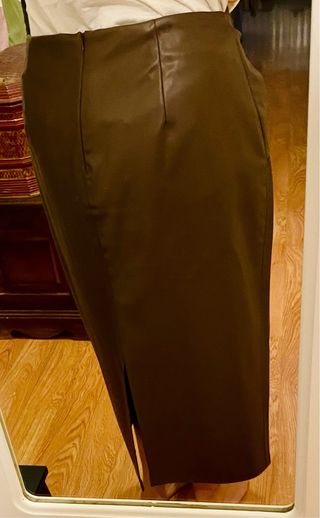 Falda de efecto piel en color marrón. Es nueva y sin estrenar. - Diseño con costuras verticales. - Corte midi.