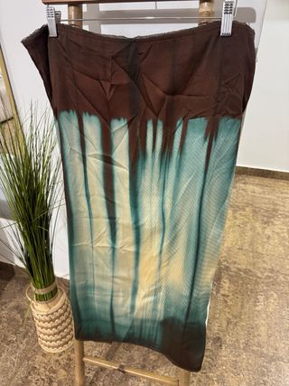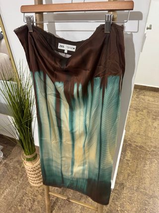 Falda midi de Zara con un estampado abstracto y degradado. - Diseño con efecto tie-dye en tonos marrones y verdosos. - Tejido satinado con caída. - Largo midi. Nuevo sin etiqueta Precio original :29,95€