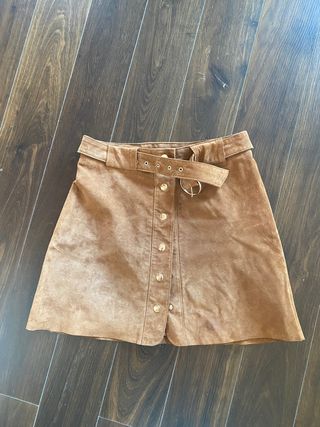 Falda mini tipo antelina marrón de Zara. Se abrocha mediante 4 botones decorativos delanteros. Lleva algo de elastano y botón de repuesto. Puesto una sola vez. En perfecto estado. Talla M