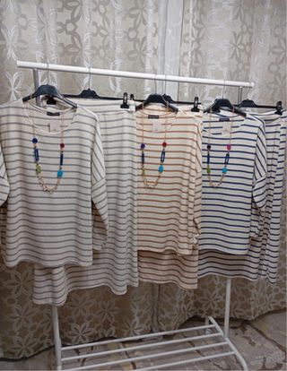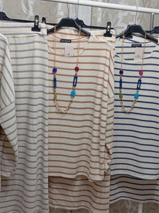 Conjunto de falda y top a rayas, ideal para un look casual. - Top de manga larga. - Falda con estampado de rayas. - Diseño a rayas en colores beige y marrón.beige y gris .
