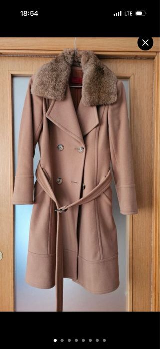 Elegante abrigo de Carolina Herrera con cuello de pelo. - Diseño cruzado con doble abotonadura. - Cinturón a juego para ajustar la cintura. - Detalle de costuras marcadas en la falda y mangas.