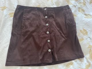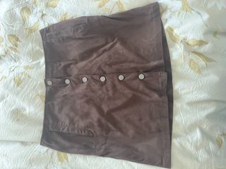 Falda corta de efecto ante en color marrón. TALLA 38 Medidas : cintura 35,5 y de largo 40 SOLO ENVÍO CON CORREOS O SEUR - Bolsillos - Cierre de cremallera oculta en la parte trasera y abertura