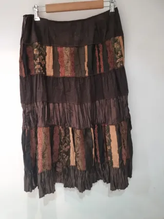 Falda larga con un diseño patchwork único, combina diversos tejidos. - Estampado floral y rayas. - Varios tonos de marrón y detalles coloridos. - Diseño en capas con volantes en el bajo.